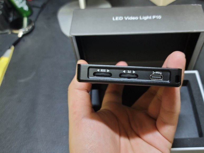 측면에는 충전 단자(USB C 타입), 이펙트 버튼 및 조명 조절 가능한 레버가 있습니다.