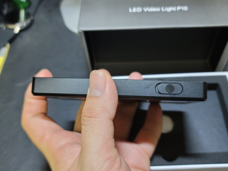 상단에는 전원 버튼이 있습니다 가방에서 눌릴수도 있어서 밀어서 전원을 키는 방식을 체택한것 처럼 보입니다.