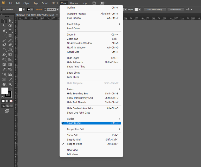 찾아 들어가는 경로는 View(보기) > Smat Guides(특수 문자 안내선) 활성화 해주세요.
