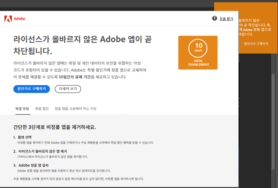 포토샵을 오래만에 실행해보니 라이선스가 올바르지 않은 Adobe 앱이 곧 차단됩니다.