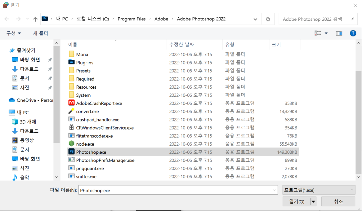 포토샵이 실행 파일을 선택해주시면 됩니다