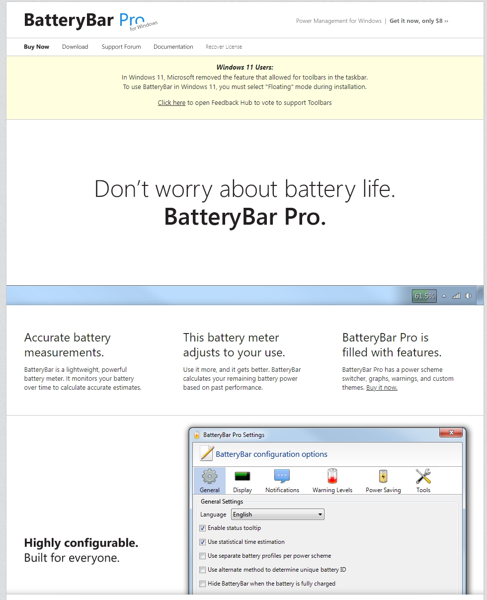 Windows 11 Users: In Windows 11, Microsoft removed the feature that allowed for toolbars in the taskbar. To use BatteryBar in Windows 11, you must select "Floating" mode during installation. Click here to open Feedback Hub to vote to support Toolbars
