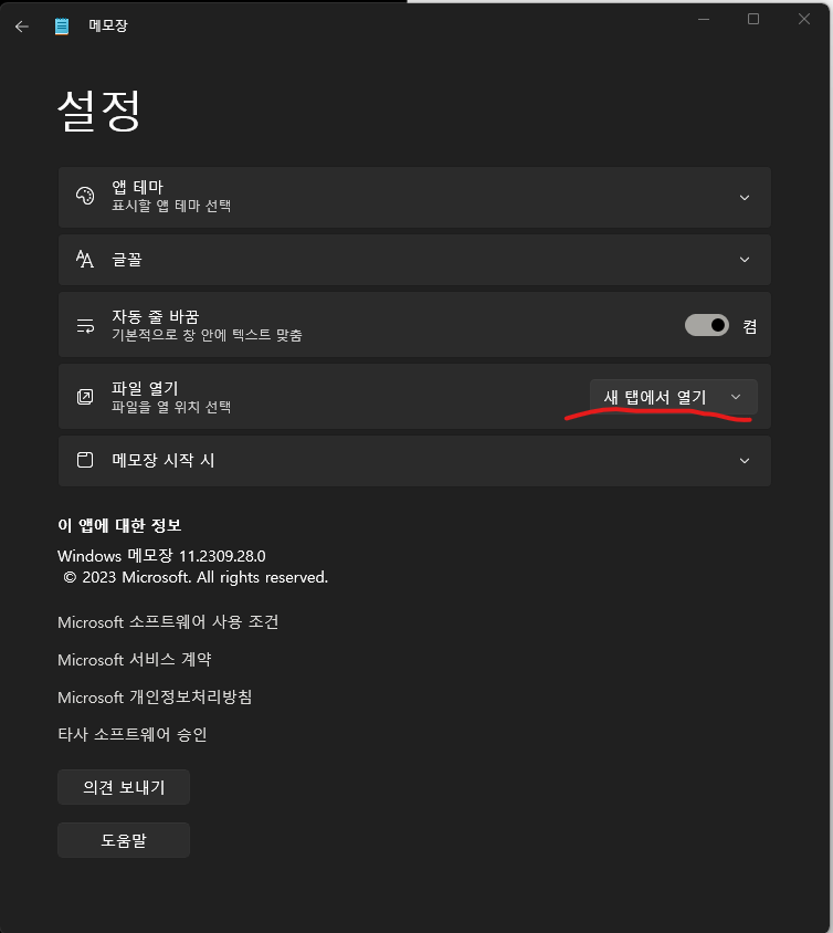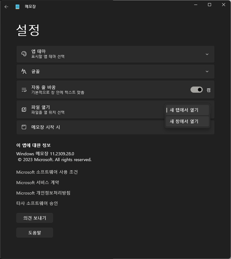 저는 메모장을 임시 적는 용도로 사용하기 때문에 "새 창 열기"로 설정했습니다.