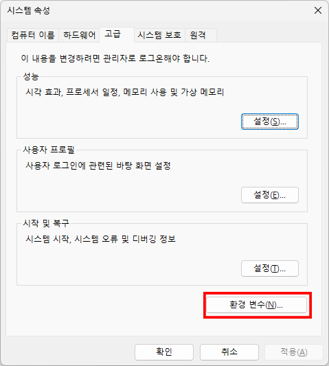 여기서 고급텝에 환경 변수를 클릭해 주세요.