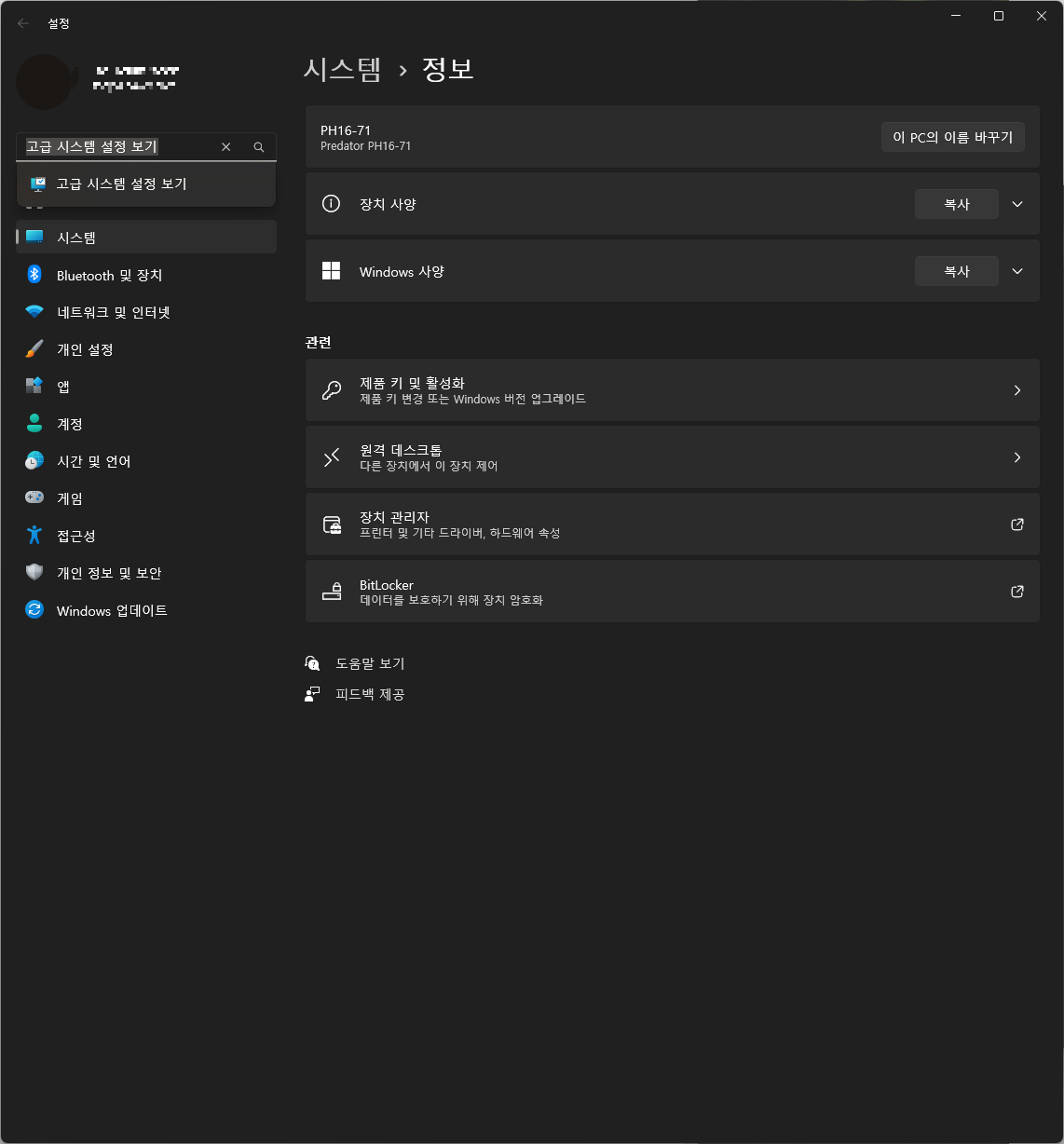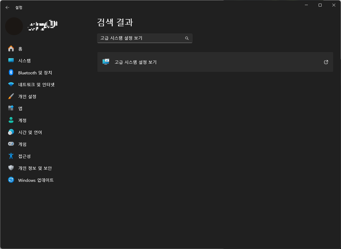 왼쪽 상단에 검색할 수 있는 부분에 "고급 시스템 설정 보기"를 검색해 주세요.