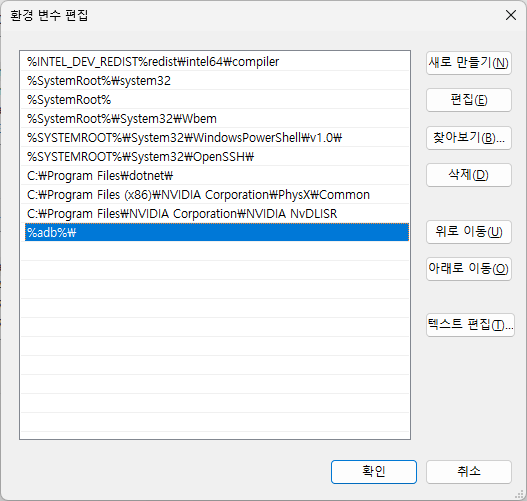 변수를 % adb%\ 와 동일하게 입력하고 확인 눌러주세요.