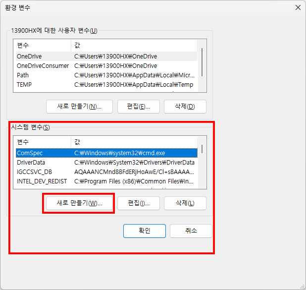 여기서 중요합니다 시스템 변수항목에서 새로 만들기를 선택해 주세요.
