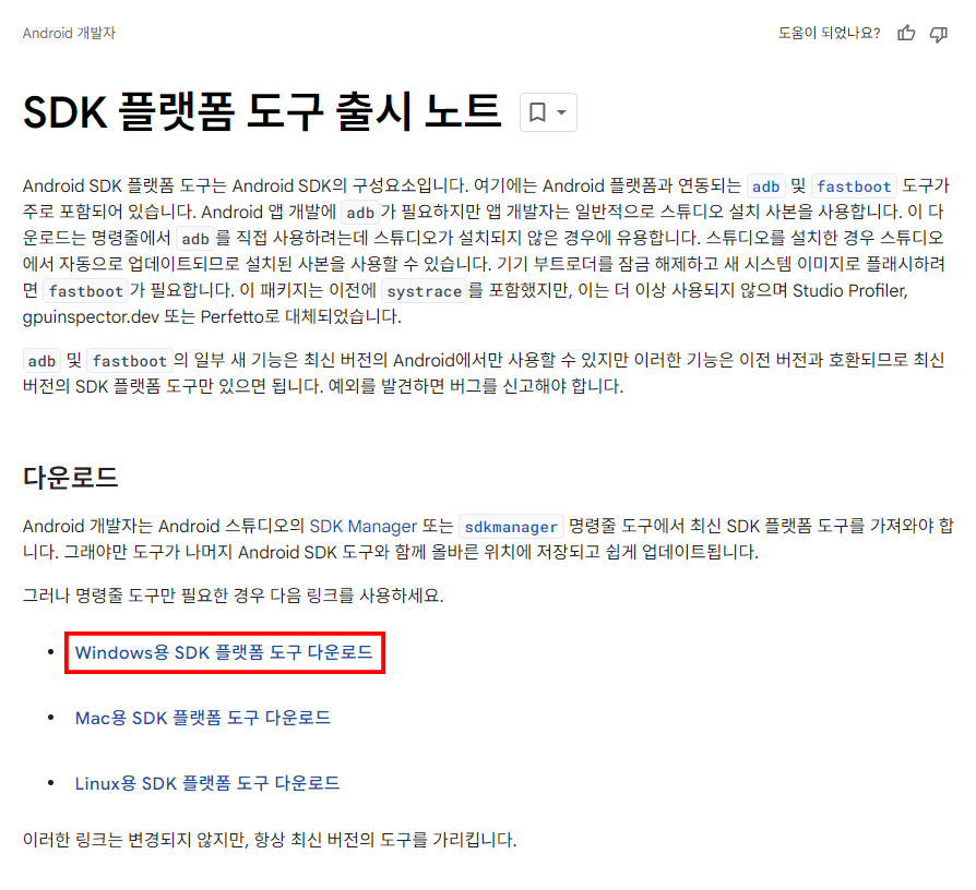 Windows용 SDK 플랫폼 도구 다운로드를 눌러 받아주세요.