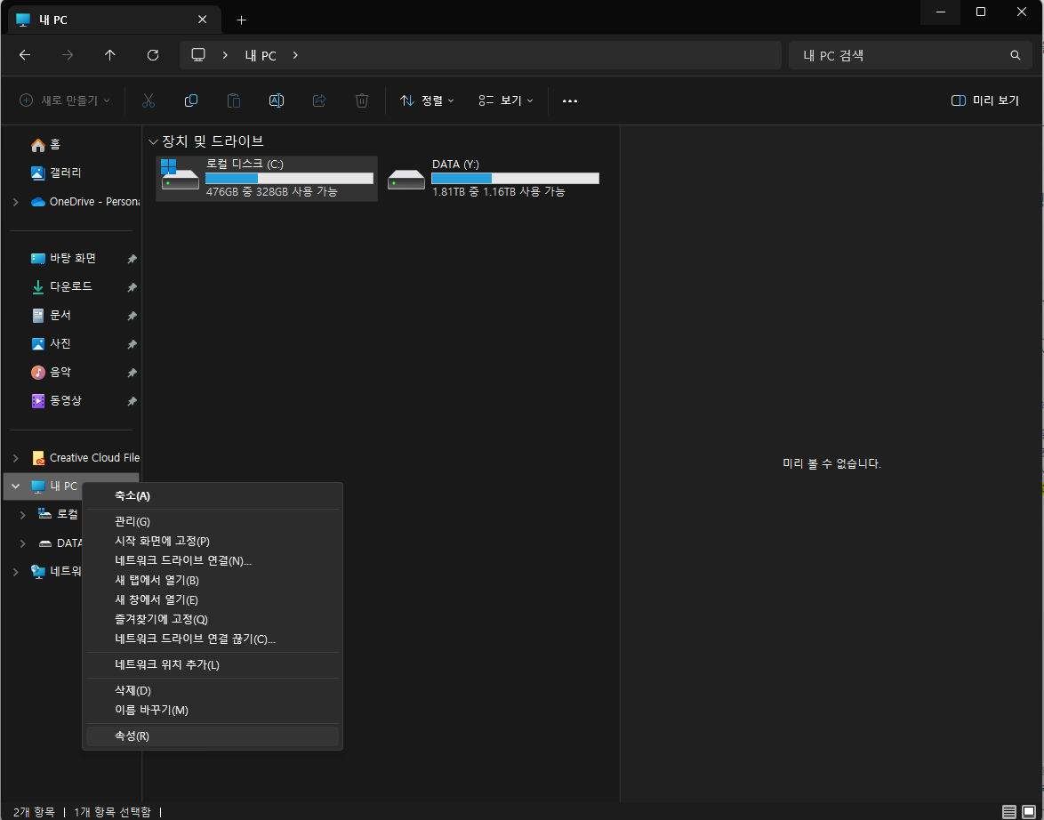 아무 탐색기에서 내 PC를 마우스 오른쪽 클릭해 주세요.