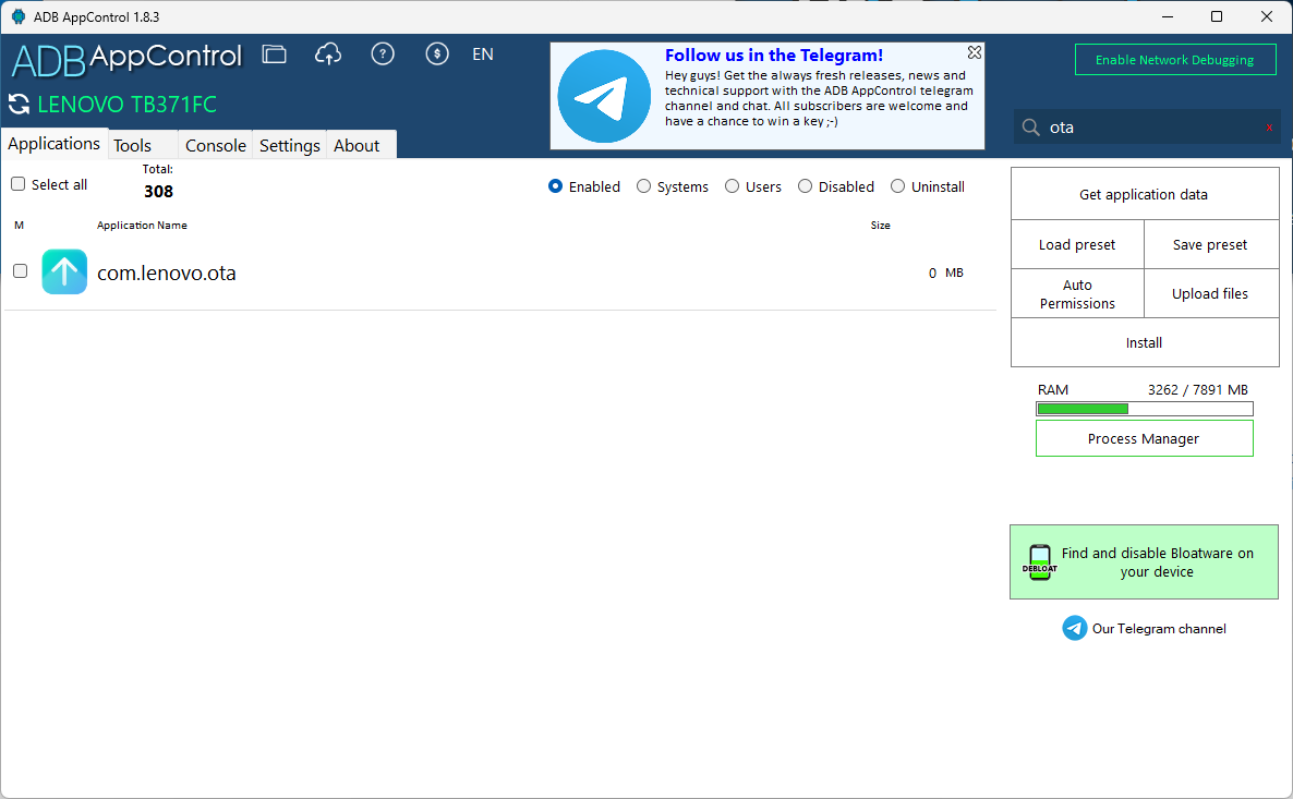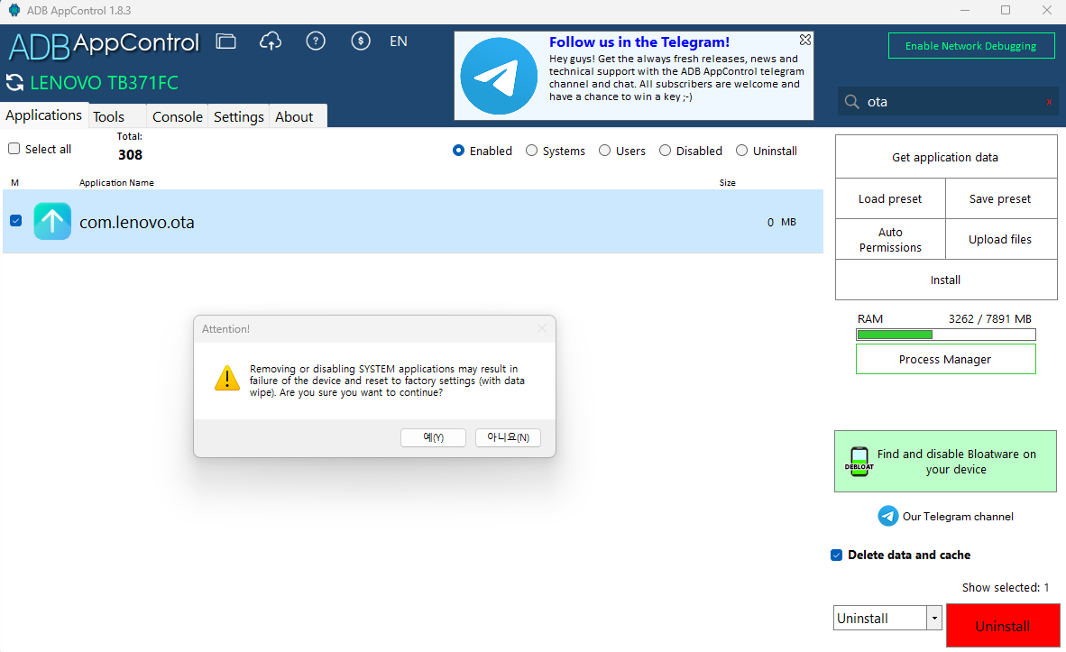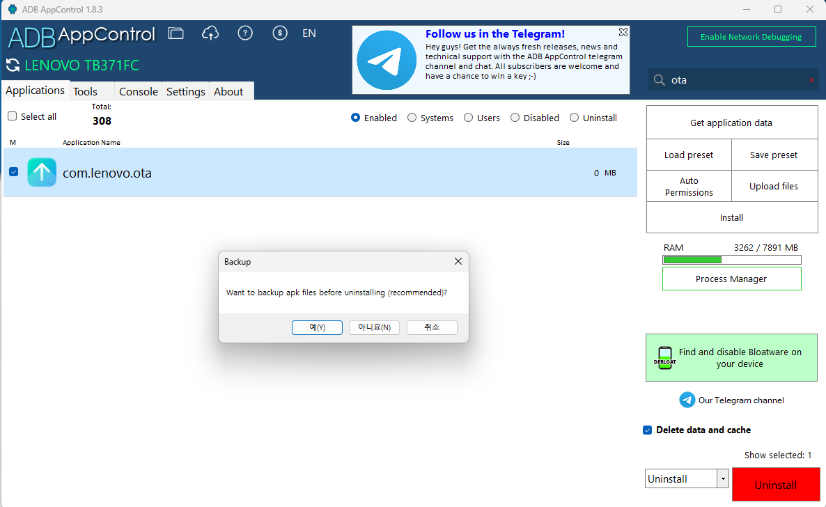 ADB를 명령어로 이용해서 삭제할 수 있지만 이번에는 ADB Appcontrol를 이용해서 삭제해 보겠습니다.