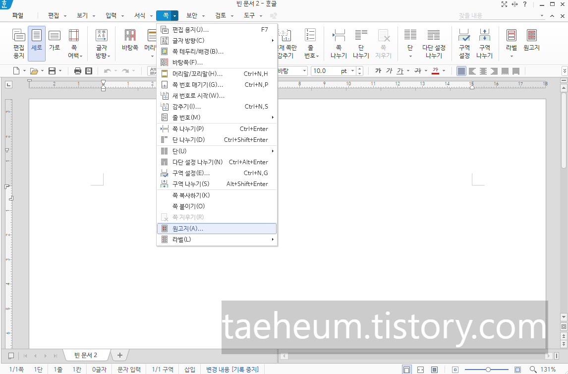 상단 메뉴중 쪽을 클릭하시면 원고지 라고 있습니다.