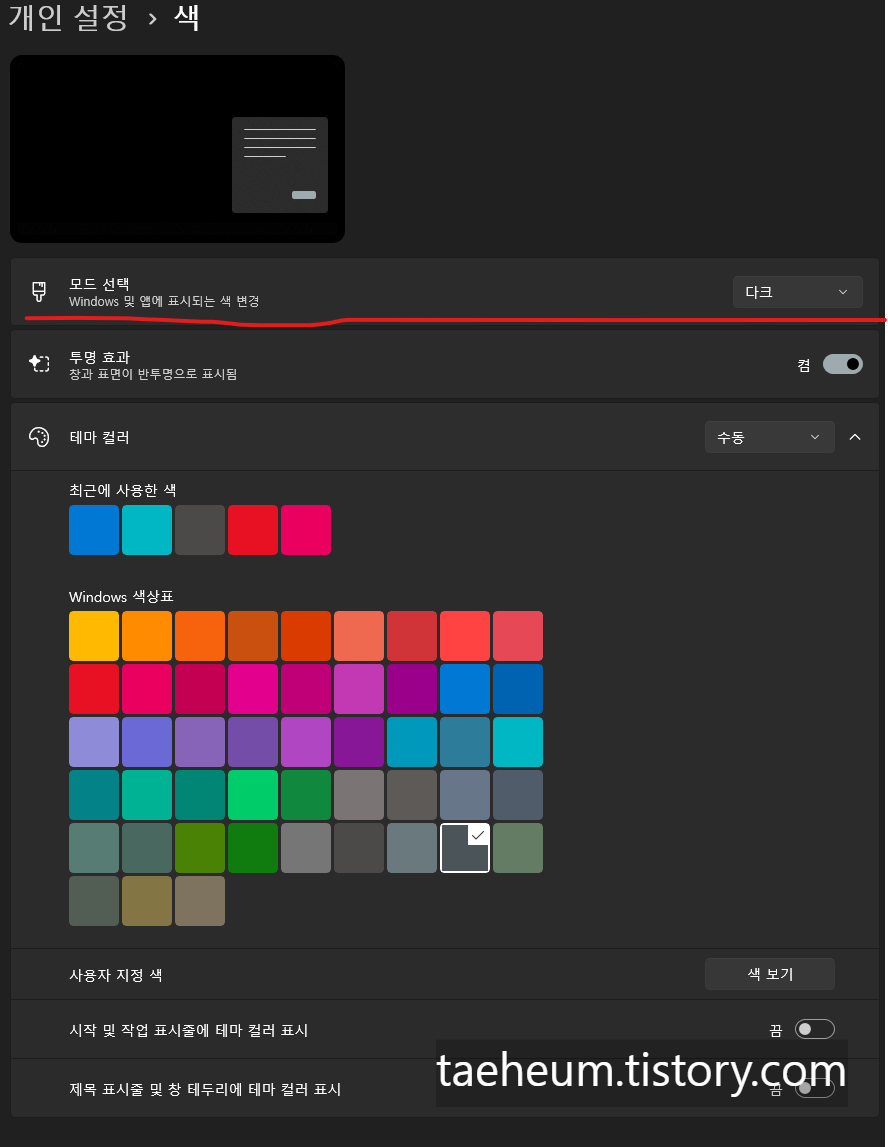모드 선택 부분을 기본값 라이트에서 다크로 변경해 주세요.