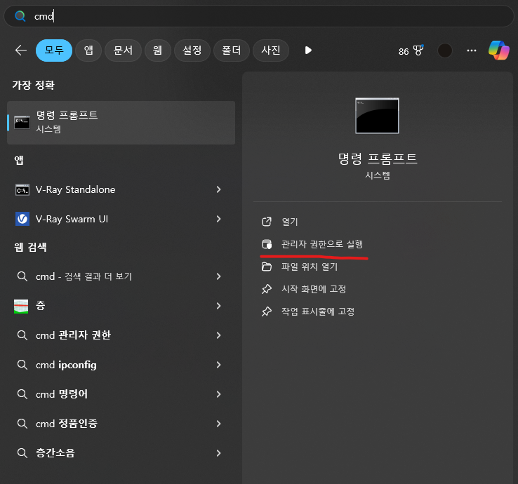 시작줄 아래에 있는 검색에서 "cmd"를 검색해서