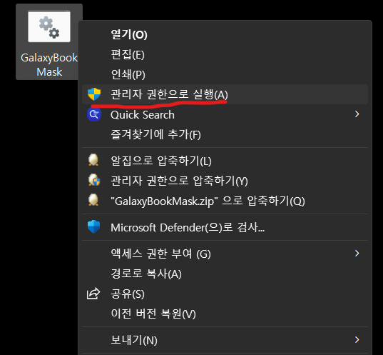 실행해 보면 갤럭시 북 또는 삼성 노트북에서만 사용가능하다고 하면서 창이 닫힙니다.