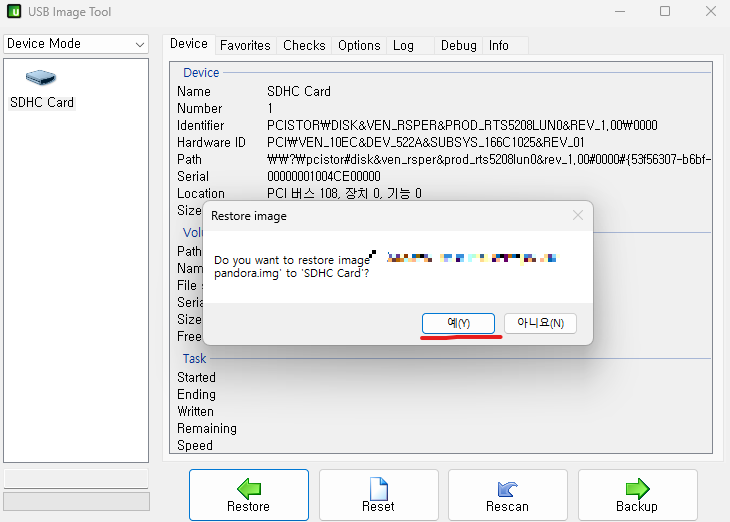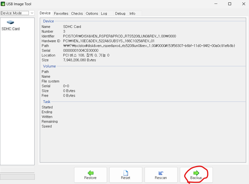 SD 메모리를 넣구 프로그램을 실행시키면 위에 이미지 처럼 Backup이 활성화 됩니다.