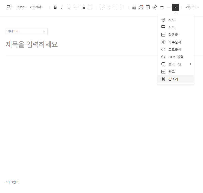 글쓰기로 들어가시면 상단에 점3개 부분을 클릭하시면 단축키라는 항목을 확인할 수 있습니다.