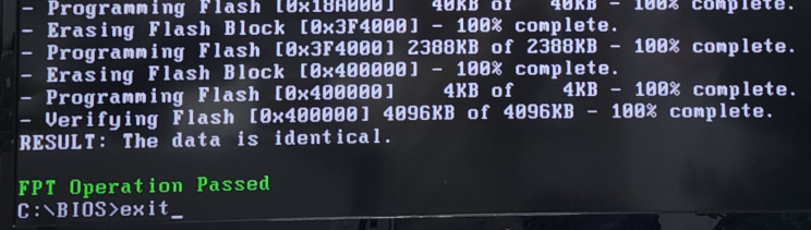 다 끝나면 아래와 같이 FPT가 뜹니다. 그럼 전원버튼을 눌러서 PC를 종료 후 상단에서 진행했던 핀 위치를 다시 돌리고 부팅하시면 됩니다.
