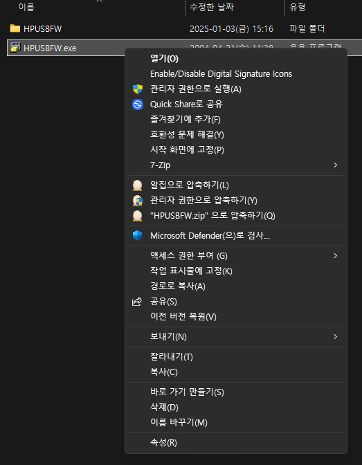 HPUSBFW.exe 파일을 관리자 권한으로 실행해 주세요.