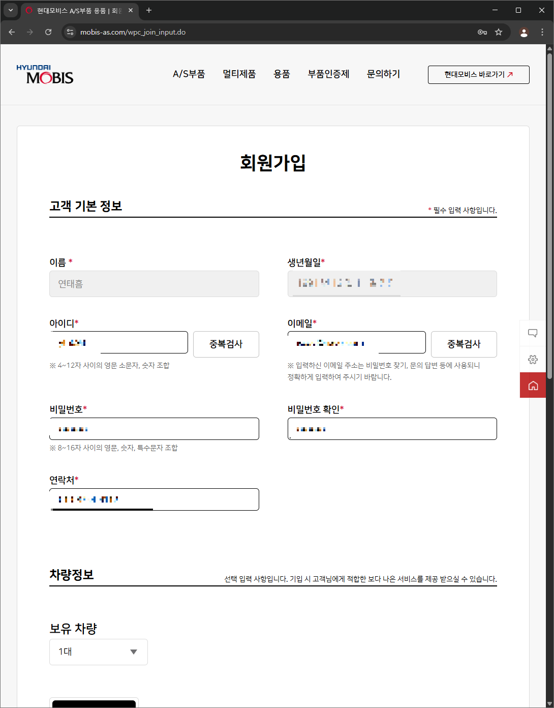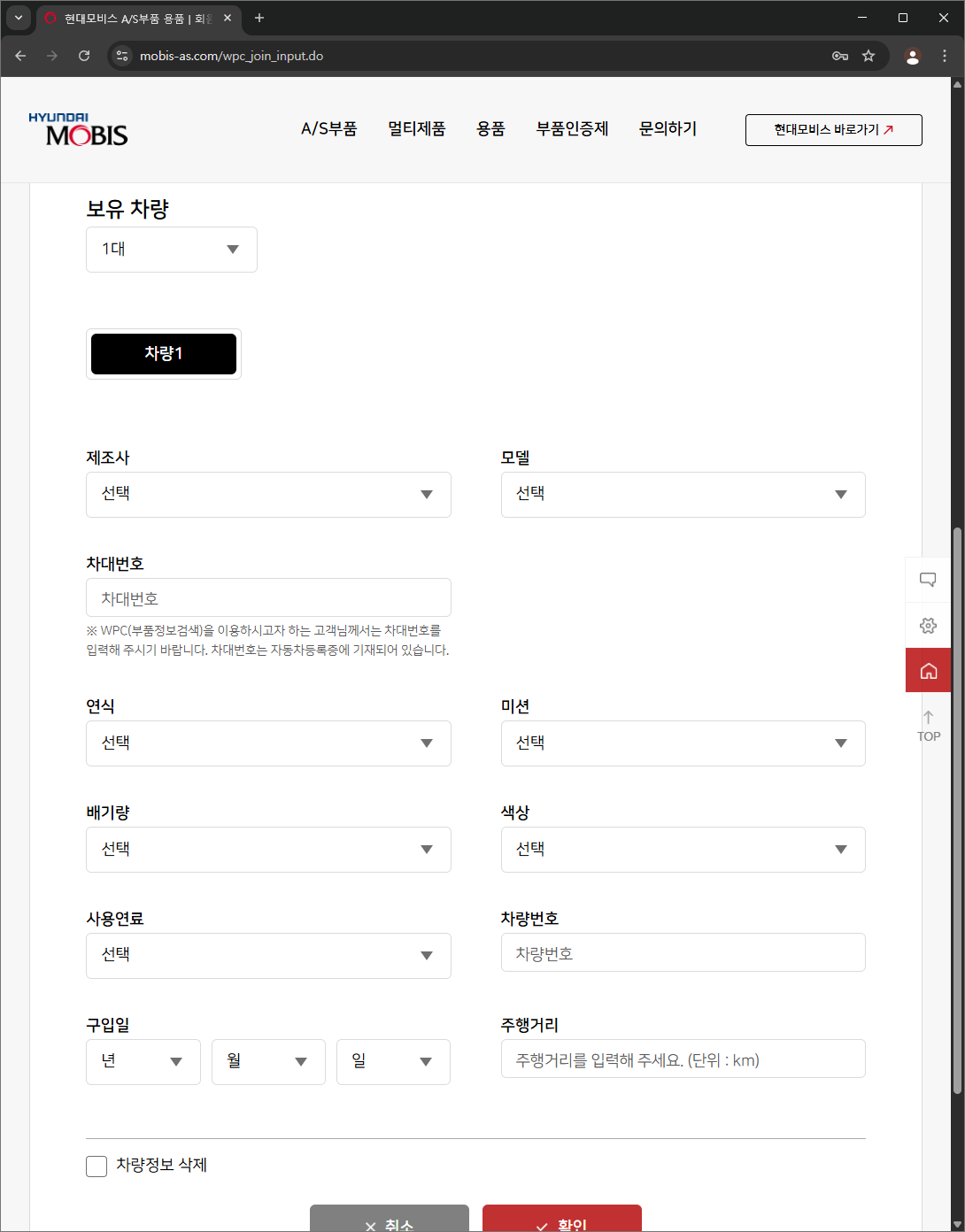 필수는 아니지만 차량 정보를 꼭 입력해 주시길 바랍니다 추후 로그인 시 필요합니다.