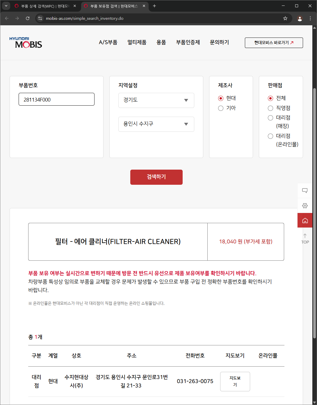 해당 부품의 제고 및 가격 판매 위치까지 알수 있습니다.