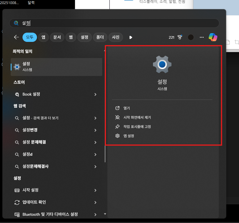 윈도 시작줄에서 설정을 검색해서 들어가 주세요.