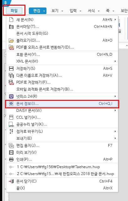 ■ 한글 문서 파일을 열고 상단탭에서 파일 -> 문서정보 메뉴 클릭