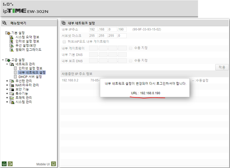 저는 192.168.0.100 으로 변경후 적용 눌러줬습니다.
