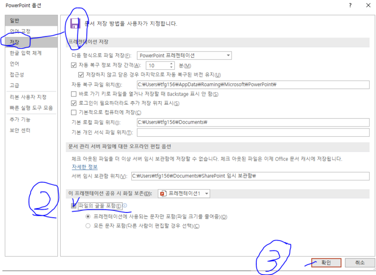 파워포인트 작업 후 타 PC로 켰을 때 폰트 부분이 없어서 틀이 트려 질 때 있습니다.