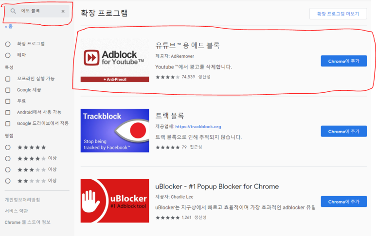 검색창에 "애드 블록" 이라고 검색해주세요.